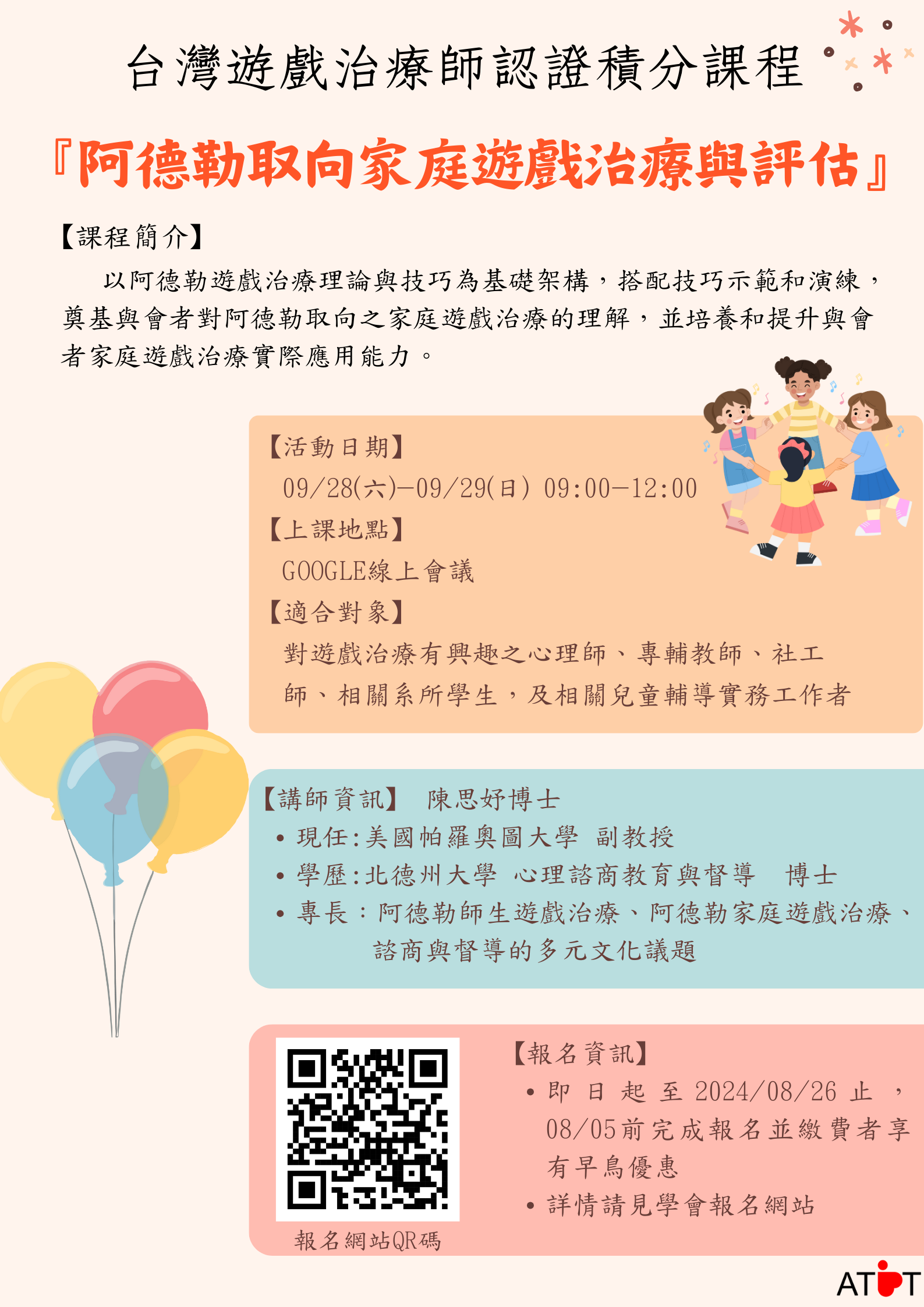 一、【2024台灣遊戲治療師認證積分課程】阿德勒取向家庭遊 戲治療與評估,課程時間及講師資訊。